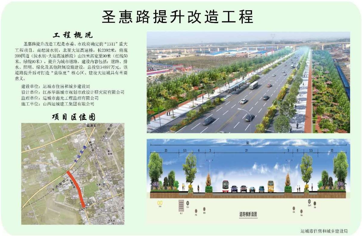 圣惠路提升改造工程是市委市政府確定的城建重點(diǎn)項(xiàng)目,南起涑水街,北至大運(yùn)高速橋,長2392米,包括道路、排水、照明、綠化及其他附屬設(shè)施建設(shè),總投資43897萬元。